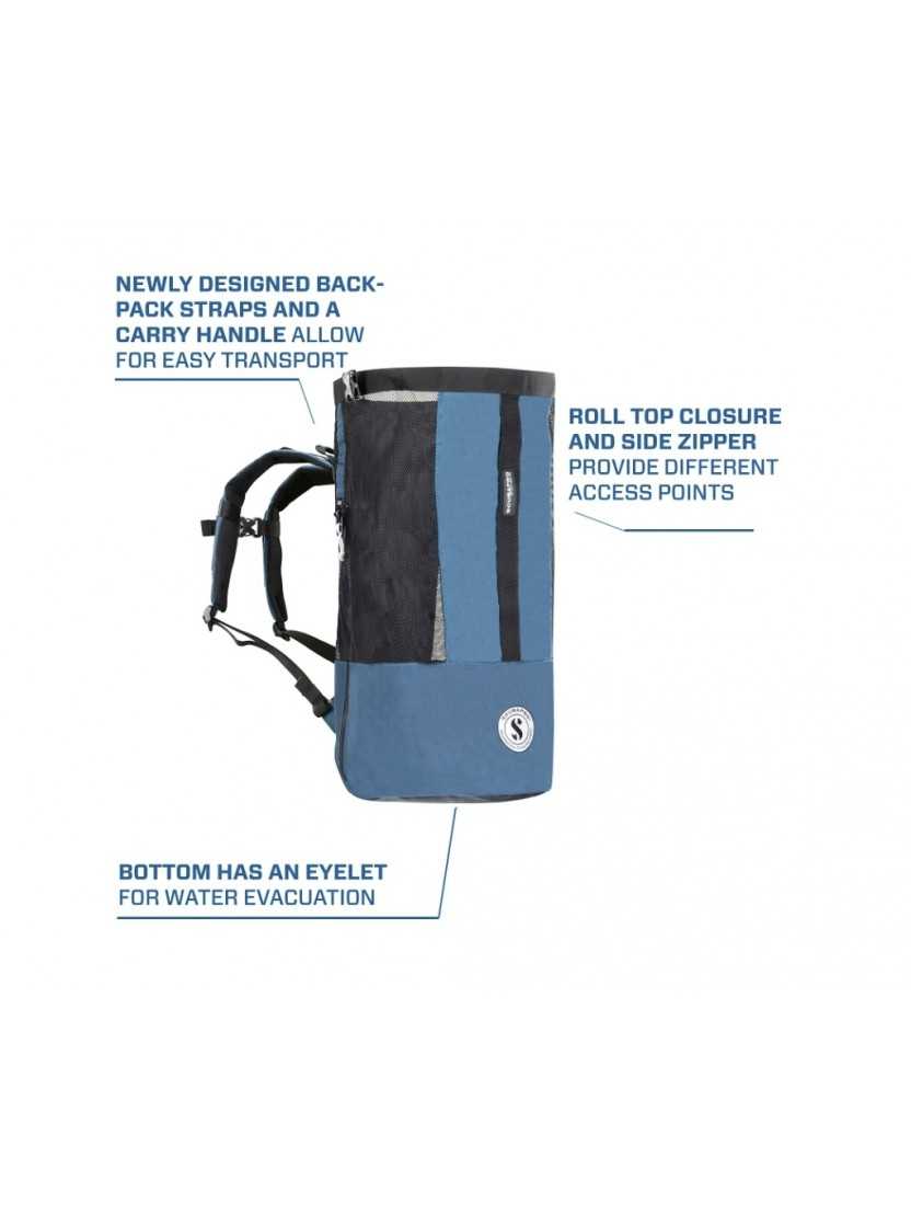 El bolso de mano perfecto para equipo de snorkel o buceo tropical. La forma cilíndrica del nuevo Sport Mesh 65 y la combinación de malla y tela azul denim lo convierten en un bolso ligero y resistente con gran capacidad.