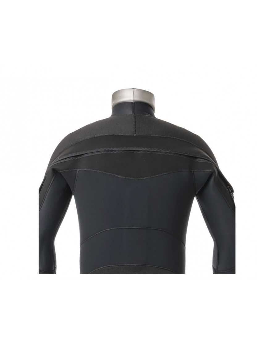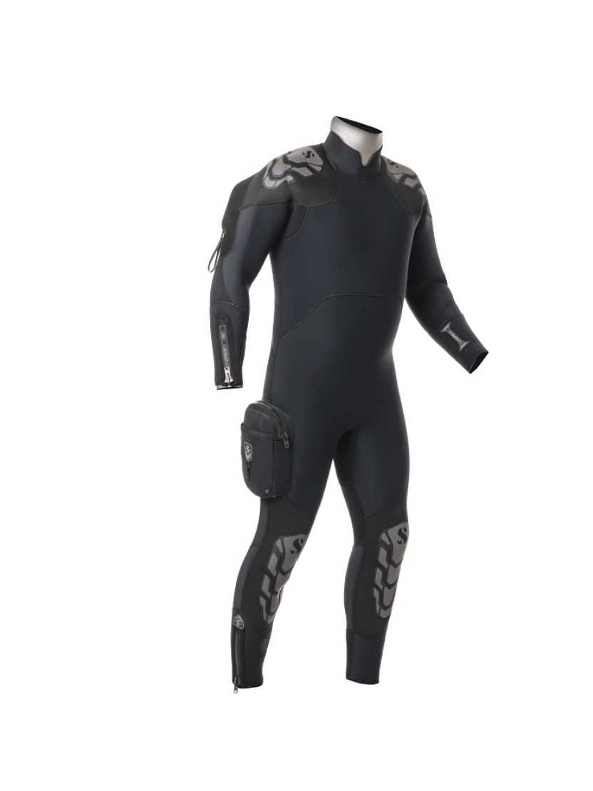 Este traje de buceo semiseco de color negro azabache es una solución sencilla para mantenerse muy abrigado y relativamente seco, a la vez que elimina prácticamente la resistencia hidrodinámica al moverse por el agua.